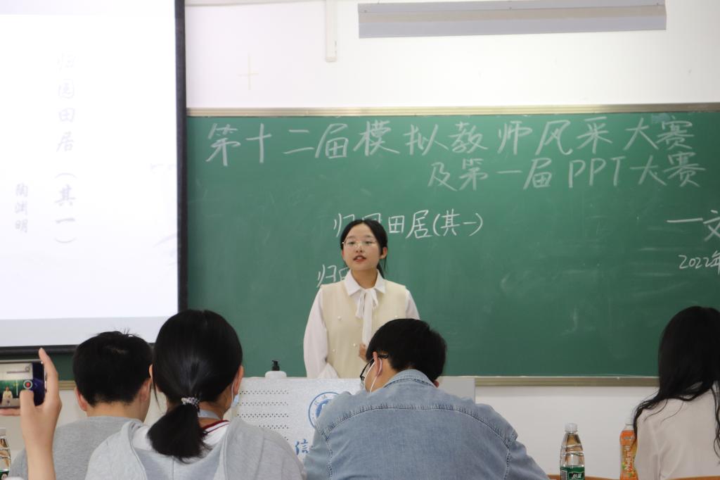 整个比赛过程中,参赛选手们通过PPT来讲解教材,生动的教学语言、得体的教学仪态、灵活的应对能力,获得了评委们的一致好评。其中,范孟何同学以一张毛主席伫立橘子洲头的图片作为切入点向我们讲述《沁园春·长沙》,从她的身上我们可以看出深厚的知识积累是作为一名教师所不可缺少的条件;刘芾以简洁明了的语言向大家讲解《归园田居(其一)》,并在课堂上积极互动,活跃课堂气氛,教法创新,极大地激发大家的兴趣;谷明由春天引出《春》,通过五个春的场面来全面描绘春日景色,运用优美的语言和生动的描述,带领学生们领略朱自清先生眼中的春。