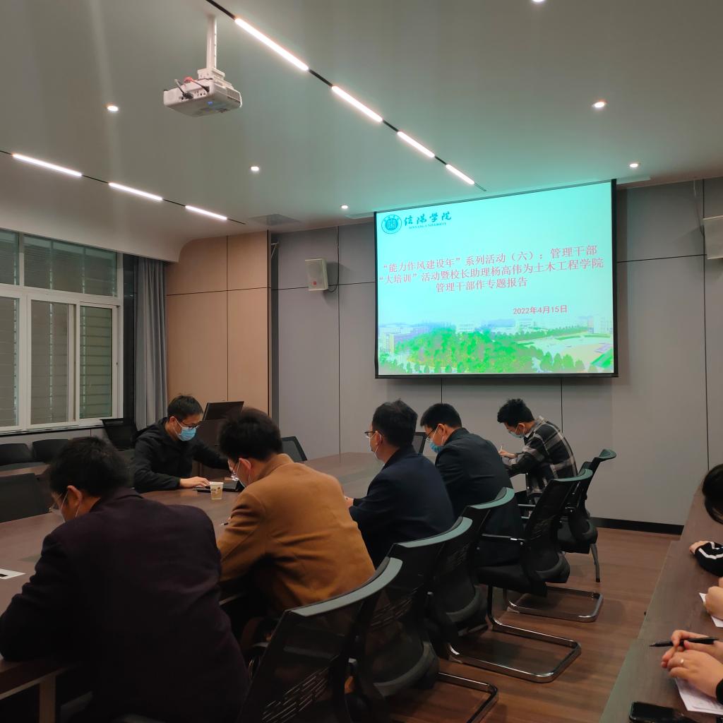 为深入贯彻省委、省委教育工委“能力作风建设年”活动动员部署会议精神,全面开展“大学习大培训大练兵大提升”,进一步推进管理干部能力大提升,作风大转变。4月15日下午,校长助理杨高伟应邀在理工楼112会议室为土木工程学院管理干部作了题为《与时俱进持续提升履职尽责能力》的辅导报告。土木工程学院党总支书记郭二军、教学副院长杨子泉、各秘书干事、教务员、实验中心主任、教研室主任及全体辅导员听了报告会。郭二军主持了报告会。