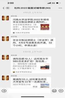 六、打造考研调剂共享平台,推进考研工作进一步提高。推进考研调剂的共享至关重要,学院专门建立线上调剂服务平台,将调剂信息、流程、注意事项等第一时间分布在群里,指定专人负责,责任到人。在2022年研究生复试的过程中,学院专门腾出会议室、办公室给学生使用;在复试过程中,学院安排学生干部在门外专人值守,保障学生面试不受干扰。指导教师经常在深夜仍在指导群里发布调剂学校信息,如今年报考昆明理工大学的李旭冰同学,初试成绩为380分,但第一志愿并没有进入面试,在考研调剂共享平台的辅助和指导教师的指导下,先后接到4所院校的调剂面试邀请,在被贵州财经大学拒录后,最终被青海民族大学录取。