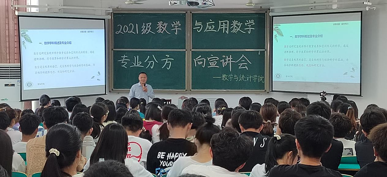 为使2021级学生深入了解专业方向的具体内容,5月6日中午,数学与统计学院在数计楼106教室召开2021级数学与应用数学专业分方向宣讲会。宣讲会由教学副院长张聪主讲,2021级数学与应用数学专业全体学生参加。