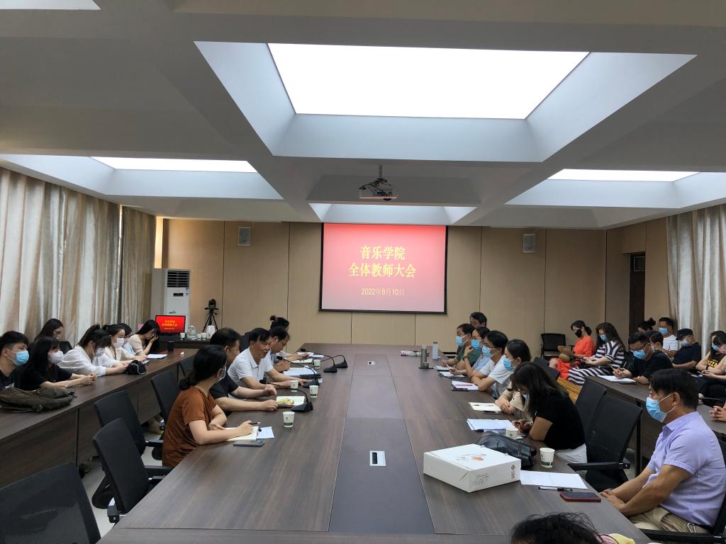 8月10日,音乐学院在艺术楼215举行了全体教师大会。校党委专职书记施昌海出席会议。院长王凯歌、党总支书记郑山峰、教学副院长杨辉及班子全体成员、学院全体教师参加了会议。郑山峰主持了会议。