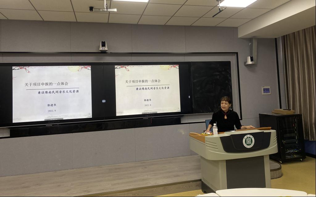 9月13日下午,由音乐学院承办的题为“关于项目申报的一点体会--兼谈豫南民间音乐文化资源”的教学沙龙在人文楼南楼智慧教室113圆满完成。活动邀请郭德华教授担任主讲嘉宾,与来自音乐学院的30余名教师围绕这一主题展开了研究与探讨。沙龙由音乐学院教学副院长杨辉主持。