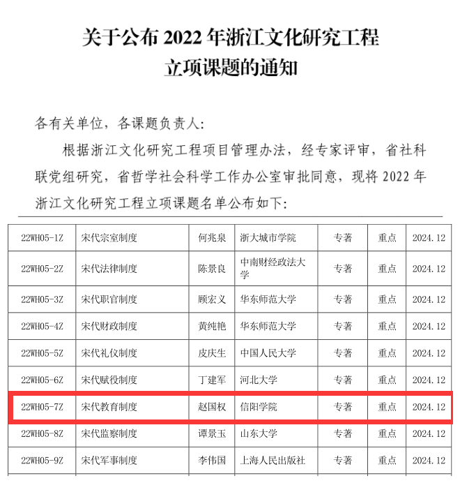 另据浙江省哲学社会科学工作办公室文件《关于公布2022年浙江文化研究工程立项课题的通知》,由我院赵国权教授申报的“宋代教育制度”获得重点课题立项,课题编号为“22WH05-7Z”,系何忠礼教授主持的重大课题“宋代制度史系列丛书”中的一项子课题。这是赵国权教授,继获批河南省兴文化工程文化研究专项“河南文庙研究”之后的又一项省部级课题,也是他长期坚持宋代教育研究的又一大进展。