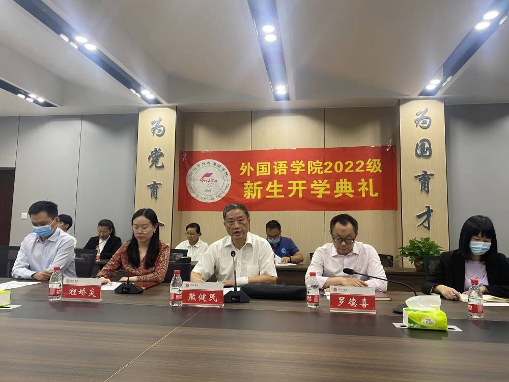 9月20日下午,外国语学院2022级新生开学典礼暨入学教育大会在外语楼110会议室主会场和207、208教室等10个分会场隆重举行,会议是采取线上线下相结合的方式开展。出席本次会议的有信阳学院战略发展咨询委员会主任熊健民、外国语学院院长罗德喜、党总支副书记程娇炎、教学副院长李静、校长办公室秘书孟祥龙、学院干事、新生辅导员、学生代表及2022级全体新生。会议由程娇炎主持。