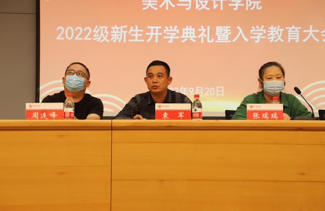 9月20日下午,美术与设计学院2022级新生开学典礼暨入学教育大会在图书馆101会议室召开,此次会议采用线上线下相结合的方式。美术与设计学院院长张瑞瑞、党总支书记袁军、教学副院长王伟、教学秘书周连峰、行政秘书李海丽、特聘教授、各教研室主任、新生辅导员及2022级全体新生参加了本次大会。会议由袁军主持。