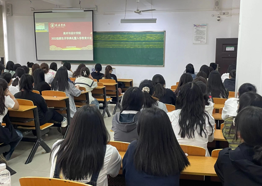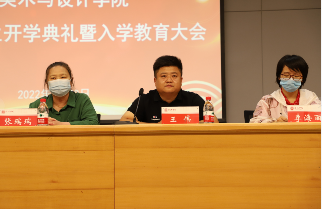 张瑞瑞院长致辞。她首先代表全院师生对新同学的到来表示热烈欢迎,向新生们介绍了美术与设计学院的发展历史、师资状况、科研实力以及人才培养等基本情况,并通过“责任”“自律”“规划”三个关键词对2022级新生表达了殷切期望。她指出,同学们进入大学,要知道对自己负责,对家人负责,对社会负责;要从被动管理向自我管理转变;要注意定好目标,找准方向,储备能量。她希望在未来四年的大学生活中,同学们能争做奋斗者,不负美好时代。