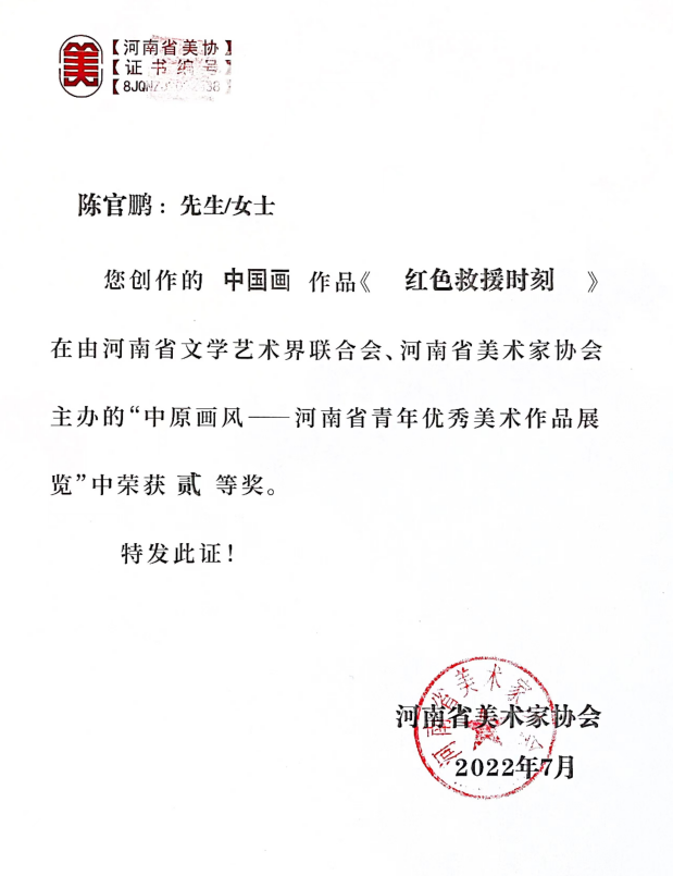 近日,“中原画风——河南省青年优秀作品展”结果揭晓,美术与设计学院青年教师陈官鹏、张纹源,在本年度“中原画风——河南省青年优秀作品展”中荣获佳绩,其中陈官鹏的中国画作品《红色·救援时刻》获得展览二等奖,张纹源的油画作品《黄河进行曲》获得展览入围奖。