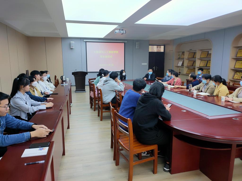 11月1日下午,大数据与人工智能学院在数计楼407会议室召开了学生座谈会。大数据与人工智能学院党总支副书记毛凤翔、教学副院长黄俊、校督导侯秀红教授、教学秘书贾彦茹、学工干事鄢杰、各教研室主任、各年级各班学生代表30余人参加了本次座谈会。会议由贾彦茹主持。