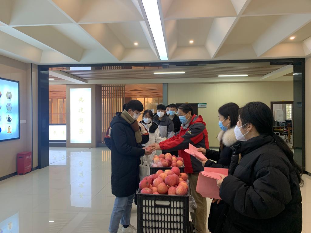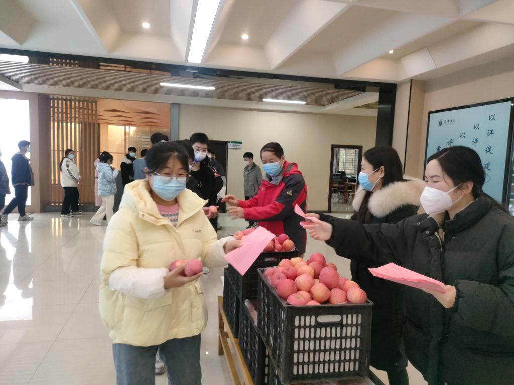 12月5日下午,理工学院院长肖生发、党总支副书记张红梅、教学副院长李晓严携学院行政班子成员、辅导员在理工楼慰问2022届考研学子。在考研冲刺的最后阶段,学院领导和教师们为紧张备考的学子们送上红澄澄的苹果和理工学院致考研学生寄语宣传页,用这样的方式表达着学院师生对考研学子们的关怀和鼓励。