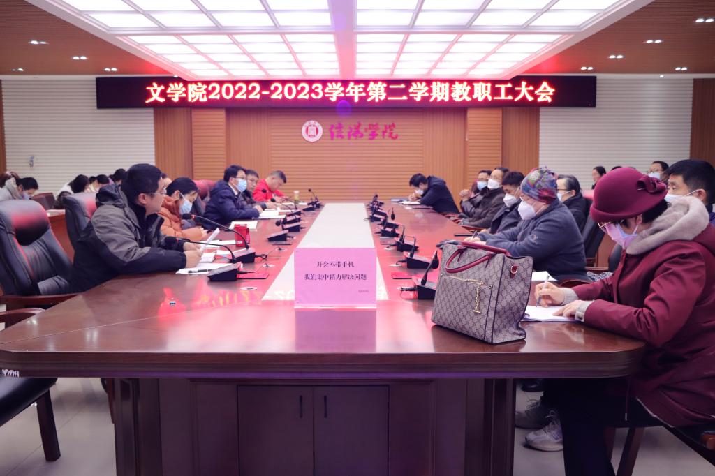 2月11日下午,我院在人文楼208会议室召开文学院2022-2023学年第二学期全体教职工大会,文学院全体教师参加了此次会议。会议由党总支书记李赟主持。