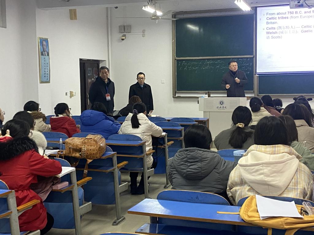 熊健民和罗德喜随机抽取411教室听取朱文莉老师讲开学第一课。课后,熊健民向外国语学院提出建议和希望:一是希望老师们不断学习,提升自身知识面的广度和深度,以适应时代的要求;二是学院要加强教学常规管理,促进外国语学院教学质量水平的提升;三是学院要踔厉奋发向前进,笃行不怠创未来,为学校顺利通过国家教育部本科合格评估打下坚实基础。