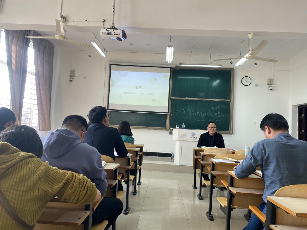 为帮助青年教师提高教学、科研水平,3月7日下午,外国语学院在外语楼202教室召开了青年教师培训会。培会训主题:路漫漫其修远兮,吾将上下而求索——漫谈我的教学科研。本次培训 由语言文学教研室王娟副教授主讲,李达主持。外国语学院院长罗德喜、党总支副书记程娇炎、教学副院长李静、学院干事、教务员和全体教师参加本次会议。