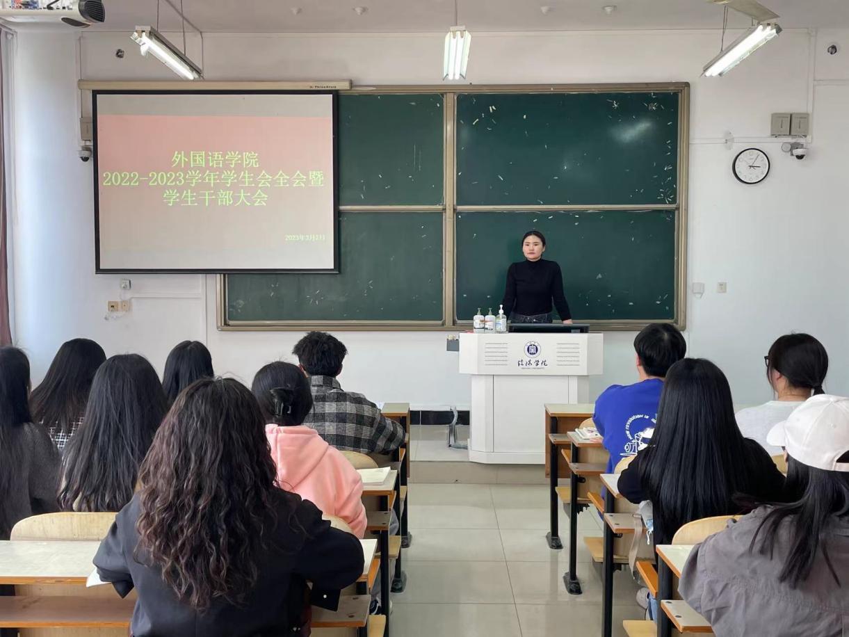为进一步促进学生会工作的开展,加强对学生会工作人员的管理,以饱满的精神状态迎接评估,外国语学院于3月7日下午在外语楼304教室开展2022-2023学年学生会全会暨学生干部大会,会上主席团及部长级学生干部进行述职报告总结。大会由团总支书记郑青主持,学生会各部门成员全体参加。