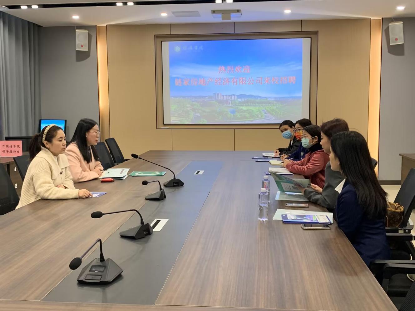 开始宣讲前,外国语学院党总支副书记程娇炎、学工干事何珊珊、2023届毕业班辅导员与链家房地产经济有限公司经理范雨涵等代表在110会议室进行了交流。程娇炎向链家房地产经济有限公司经理介绍了2023届毕业生生源情况、就业需求、就业意愿等,招聘经理介绍了此次招聘需求,我院往届毕业生在公司的发展情况。程娇炎表示,希望能与链家建立长期合作关系,在实习基地建设、在校生求职就业培训等方面继续开展深度合作。