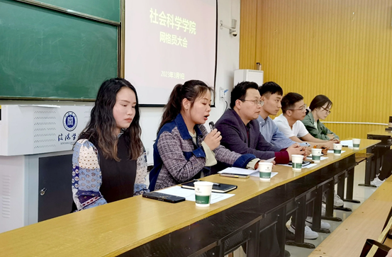 3月9日中午,社会科学学院在社科楼219教室召开网格员大会。本次大会由陈苗苗老师主持,主要参会人员有党总支副书记胡志国、全体辅导员、社会科学学院2020、2021、2022宿舍长和2020、2021级党员同学。