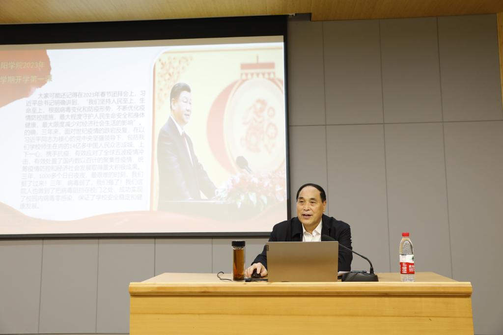 王北生围绕三年抗疫的非凡实践、三年抗疫的成功经验、让青春在新时代崭放青春之花三个方面的内容,为师生们讲授了一堂生动的思政课。他结合信阳学院优秀学子成长成才的故事,勉励广大青年学生奋发图强,学好本领。