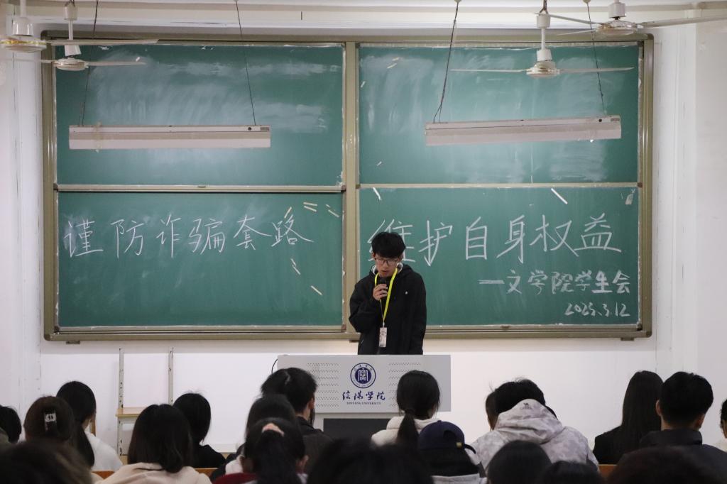 为维护学生权益,提高大学生权益保护意识,值此315“国际消费者权益日”来临之际,文学院开展了315“防诈骗与权益保护”活动,各班级劳动委员参加了此次活动。由学生会权益部干事徐留洋和刘羽飞主持。
