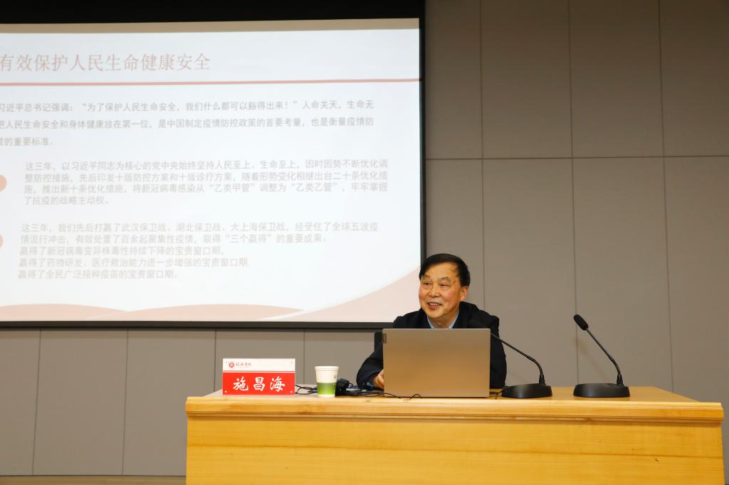 施昌海以“不负时代 不负韶华 争做堪当民族复兴重任的时代新人”为题,从回顾我国三年抗疫的非凡实践、学习贯彻党的二十大精神、勉励青年学生在新时代绽放绚丽之花三个方面展开讲授。