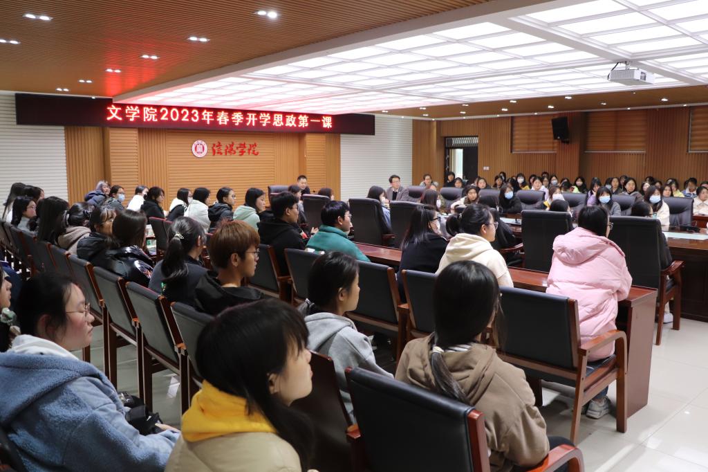 为使同学们更加坚定党的信仰,不负韶华,争当民族复兴大任的时代新人,3月18日下午,信阳学院校长助理张永志在人文楼208会议室为同学们讲授新学期思政第一课。文学院党总支书记李赟与一百余名同学参加学习了本次课程。