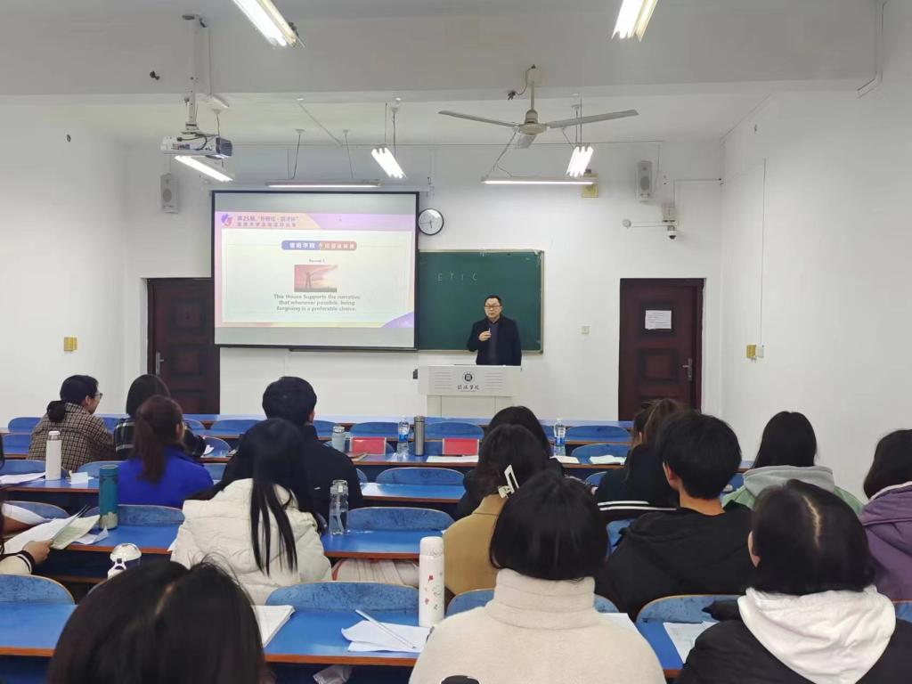 为引导全国高校广大青年学生积极践行社会主义核心价值观,加强高校校园文化建设,帮助学生开拓国际视野,更好地讲好中国故事,传播好中国声音,信阳学院外国语学院第25届“外研社·国才杯”全国大学生英语辩论赛校园选拔赛复赛和决赛(暨信阳学院第七届英语辩论赛)于3月19日在外语楼206教室举行。外国语学院院长罗德喜教授、张倩倩老师、董文静老师、吕含老师、邱梦瑶老师以及余静老师担任本次复赛的评委。
