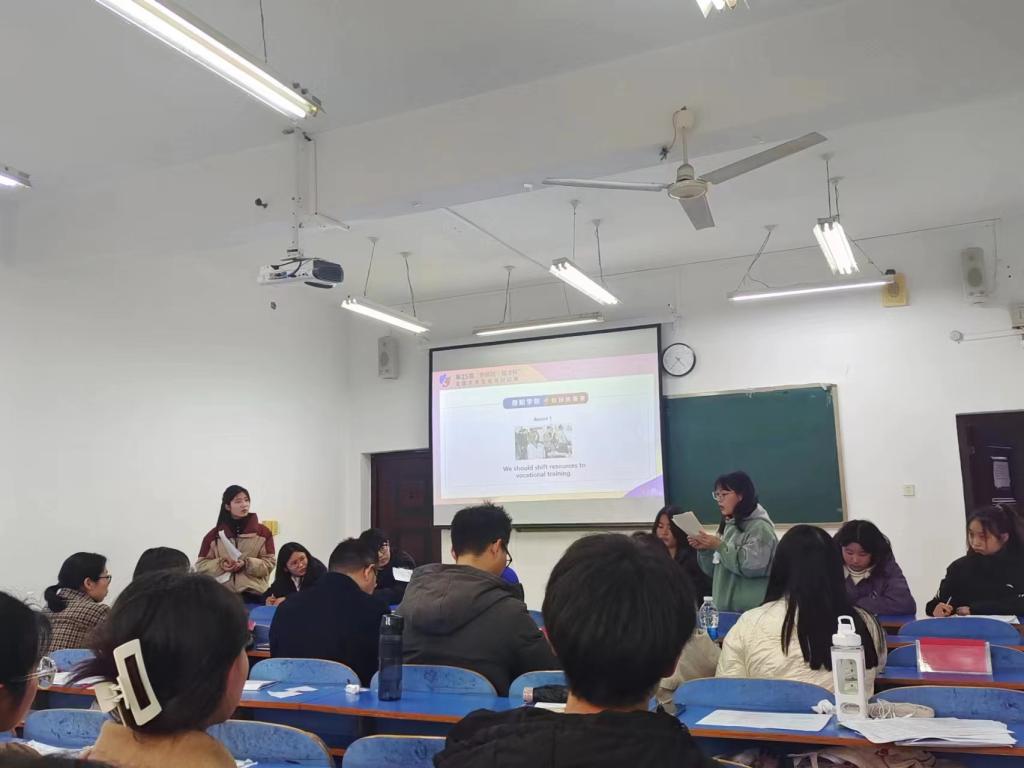 本次比赛采取复赛与决赛连续进行的方式进行。复赛阶段,16位初赛晋级选手根据抽签结果随机组成4支队伍,两两进行辩论。各组就“We should shift resources to vocational training.”这一辩题展开激烈辩论,辩手们口语表达流利,观点紧扣主题,也让在场观众感受到了外院学子严谨的思维能力。经过激烈角逐,崔雪洋等8名选手成功晋级决赛。随后,董文静老师向同学们分享经验,并提出建议。