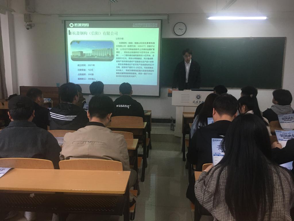 为了更好地促进2023届毕业生多渠道充分就业,4月22日下午,杭萧钢构(信阳)有限公司专场招聘会在理工楼307教室举行。土木工程学院学工干事徐超、毕业班辅导员徐飞及2023届部分毕业生参加了此次招聘会。