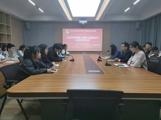 为深入学习贯彻习近平新时代中国特色社会主义思想,认真做好党员组织发展工作,5月6日下午,社会科学学院在社科楼419会议室举行第十四期入党积极分子培训班开班仪式。党总支副书记胡志国,学生党支部书记陈苗苗、张雪梅和本期34名入党积极分子参加了本次活动。陈苗苗主持了开班仪式。