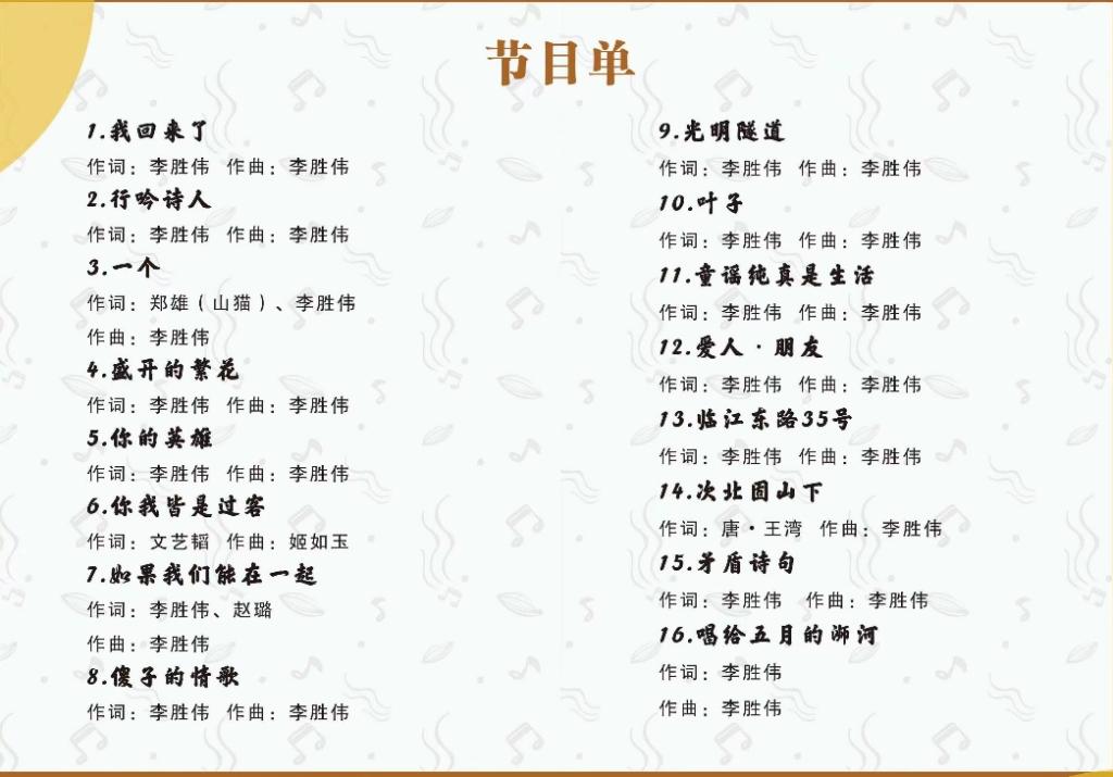 音乐会以一首轻盈、欢快的《我回来了》拉开序幕,表达着李胜伟对母校和恩师的思念之情以及对学弟学妹们的诚挚期望。紧接着,《行吟诗人》《你的英雄》《一个》《盛开的繁花》《光明隧道》等几首原创歌曲把音乐会推向了高潮,李胜伟的歌声时高亢有力,时而悠扬婉转,现场观众们的情绪也跟着起起落落。《童谣纯真是生活》《爱人朋友》《临江东路35号》《次北固山下》《矛盾诗句》这些歌曲仿佛把观众带到广阔无垠的草原上,做一个自由自在的行者,有回忆过去,唤起听者对曾经点点滴滴的留恋,有记叙现在,展现生活里的万般无奈。