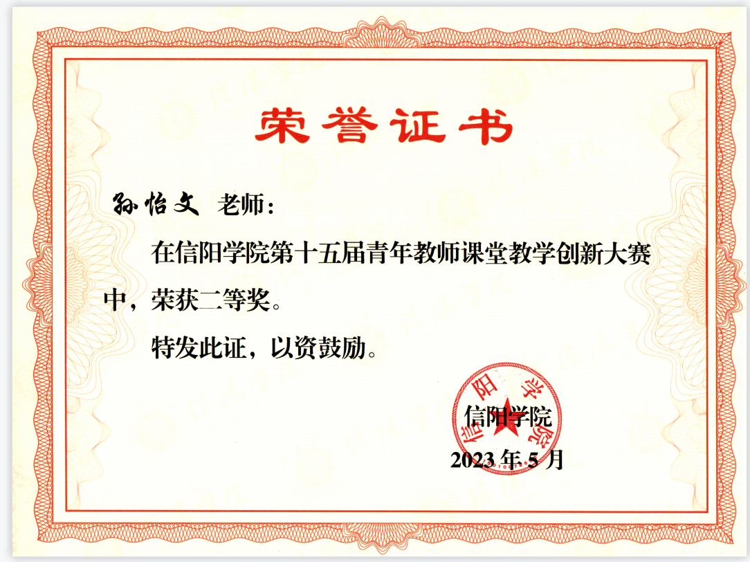近日,信阳学院第十五届青年教师课堂教学创新大赛决赛落下帷幕。我院推荐参赛的两位教师孙赛赛和孙怡文,凭借优秀表现分别斩获一等奖和二等奖。