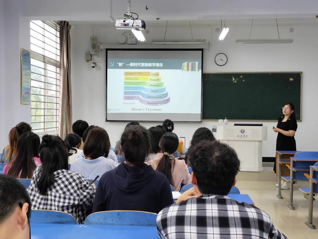 首先,王晓梦介绍了本次培训会的主题为“心”“新”相依综合英语课程思政教学。内容主要包括课程实施依据与单元设计及单元教学比赛节选两部分。其次,她提出“心”与“新”为什么是相互依存的关系的问题,引发新入职教师思考及讨论。接着,她向新入职教师分享自己对于“心”和“新”的理解。表示“心”即初心、立德树人的使命;“新”即新时代更新教学理念。详细介绍高校人才培养质量的关键、怎样落实立德树人、结合“学习金字塔”理论理解学习力教学法等内容。最后,王晓梦向新入职教师分享自己在校十五届课堂教学创新大赛中的单元设计及单元教学比赛经验。主要包括课前、课中及课后分阶段小任务,“教-学-评”一体化等内容。
