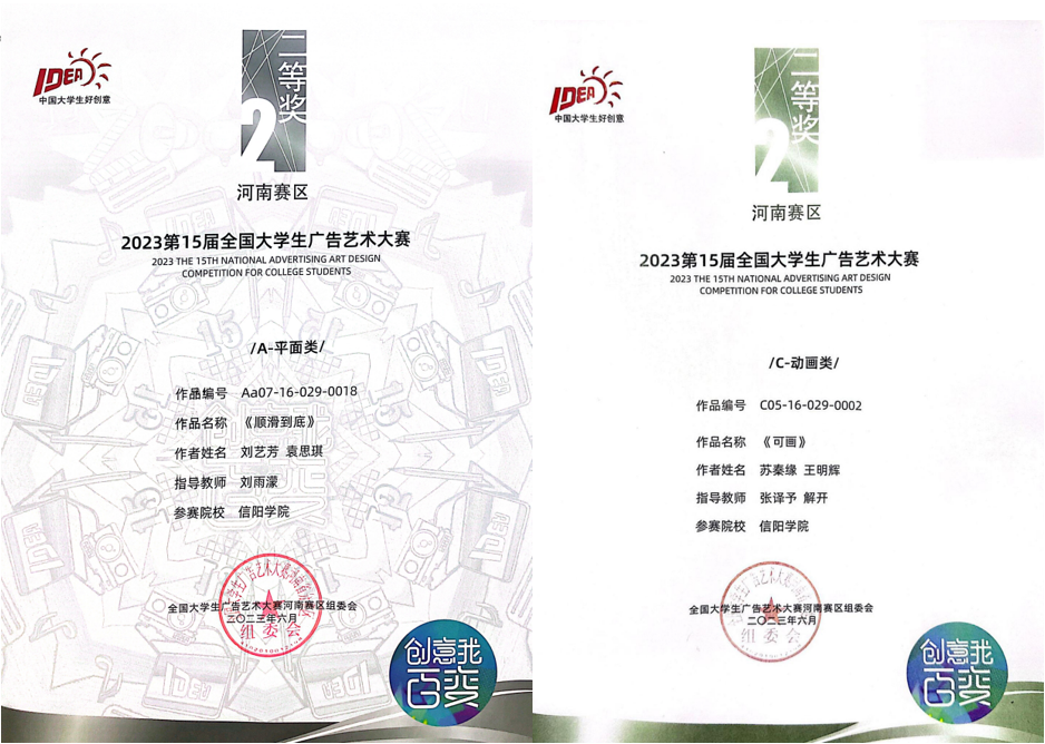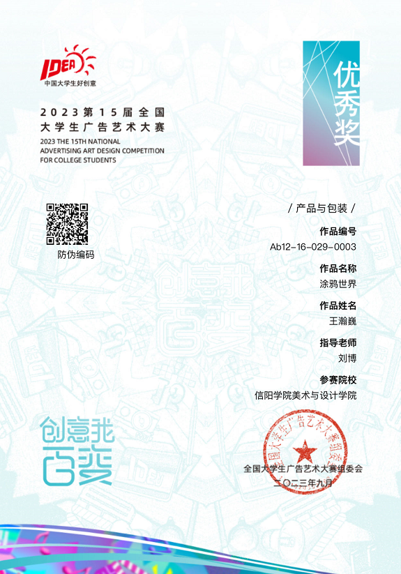 美术与设计学院视觉传达设计、数字媒体艺术专业学生在教师们的指导下参加了此次大赛。学生王瀚巍同学的设计作品《涂鸦世界》荣获国家级优秀奖;在河南赛区中,赵怡薇《雕牌清洁除菌》,刘艺芳、袁思琪《顺滑到底》,李雪晴、闫欣雨《雕牌洗衣店》,王瀚巍《涂鸦世界》,孙戈普、白雨露《哈哈TV》,苏秦缘、王明辉《可画》等设计作品获二等奖;张万权《万物皆可画》,陈栋梁、刘翔《无“即”而生妙不可言》,张茜《做设计竟可以这么快!》,王路瑶《掌握自由绽放》,朱骊安、张聪《沃派更快更广》,张灿婕《XPPEN》,赵瑞雪、胡思琪《追逐梦想绘真我》,彭轶飞、代悦悦《捕捉生活色彩》,施姿瑶《IP形象设计-泡泡玛特》,李美佳《可画,时刻设计》等设计作品获三等奖。我院刘博、刘雨濛、郑满意、解开、张译予获优秀指导教师。