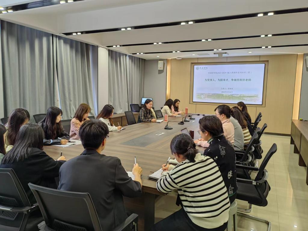 为了更好地促进新入职教师的成长,提高新入职教师教育教学质量,9月26日下午,外国语学院在外语楼110会议室召开了主题为“为党育人,为国育才,争做四有好老师”的新入职教师培训会。全体新入职教师出席了本次培训会。本次培训会由程娇炎主讲。