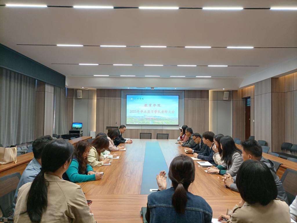 为保障教育学院2023—2024学年本科毕业实习工作顺利实施,10月8日上午,学院在社科楼109会议室召开实习带队教师工作会,教学副院长段海丹,教务员崔浩、文颜琳以及全体带队教师参加了本次会议。
