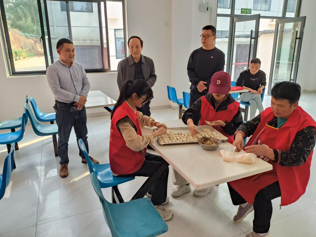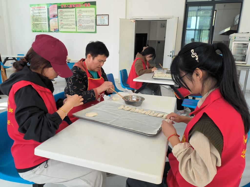 社区党总组织书记赵军,美术与设计学院党总支书记袁军、学生第二支部书记秦金峰与学生党员志愿者在社区工作者的带领下抵达综合养老服务中心。志愿者们与工作人员一同准备活动场地,与工作人员相互协作,拿出准备好的食材,和面、拌馅、擀皮、包饺子、摆盘等等,大家干劲十足,热闹无比。志愿者还将为老人包的饺子码放得满满当当,寓意祝福老人幸福美满。