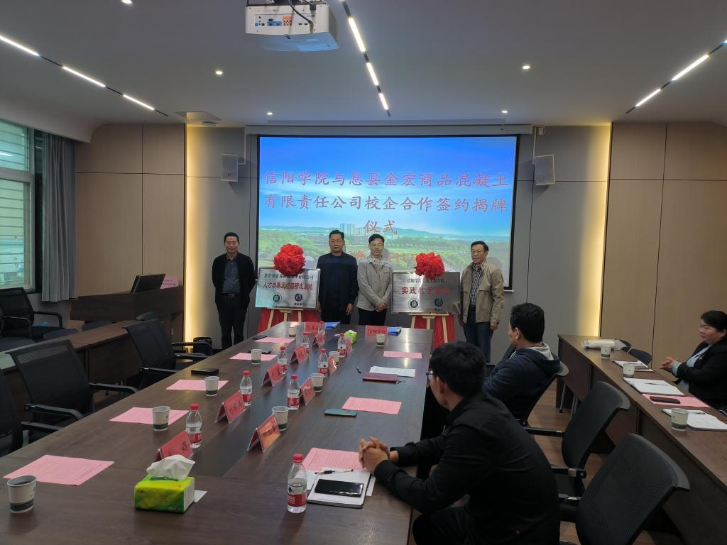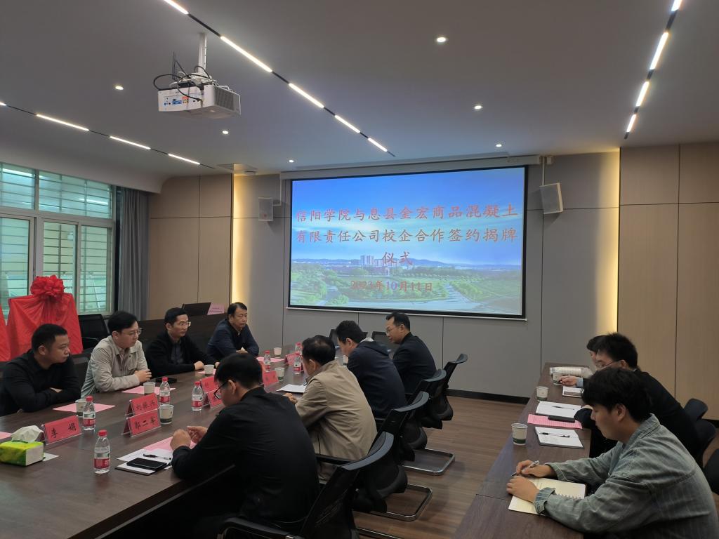 10月11日上午,信阳学院与息县金宏商品混凝土有限公司校企合作签约揭牌仪式在理工楼112会议室举行。息县金宏商品混凝土有限公司总经理舒磊、财务总监陈建华、人事主管李娟,罗山博太建材公司总经理陈光美、副总经理刘振兴,信阳学院教务处处长陈文涛、土木工程院名誉院长、党总支书记郭二军、教学副院长杨子泉、部分教师及学生代表参加了仪式,郭二军主持了签约仪式。