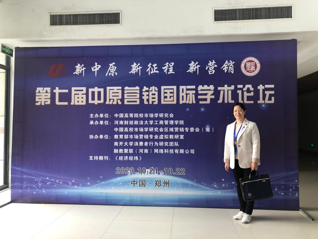 10月21日至22日,第七届(2023)中原营销国际学术论坛在郑州举行。本论坛由中国高等院校市场学研究会主办,河南财经政法大学工商管理学院承办,教育部市场营销专业虚拟教研室、南开大学消费者行为研究团队、融教聚联(河南)网络科技有限公司共同协办,《经济经纬》期刊支持。我校商学院管理学教研室老师王喜凤参加了本次论坛。
