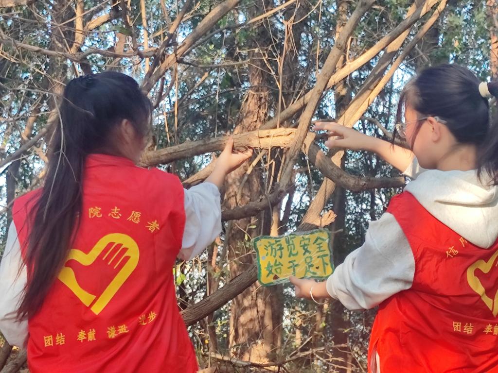 在出发前一天,志愿者们亲手制作了护绿标语牌。出发当天,志愿者们在贤山下排好队,随后井然有序地从小路上山。在爬山途中,志愿者们把道路两旁的垃圾都捡起来放进垃圾袋里,最后,志愿者们把制作的标语警示牌挂在道路两边的树枝上,提醒爬山的游客小心脚下,警示人们爱护环境。本次活动,使志愿者们切身感受到了护绿的辛苦和保护环境的重要性,同时用行动积极引导更多的游客主动走进山林,参与护绿活动。