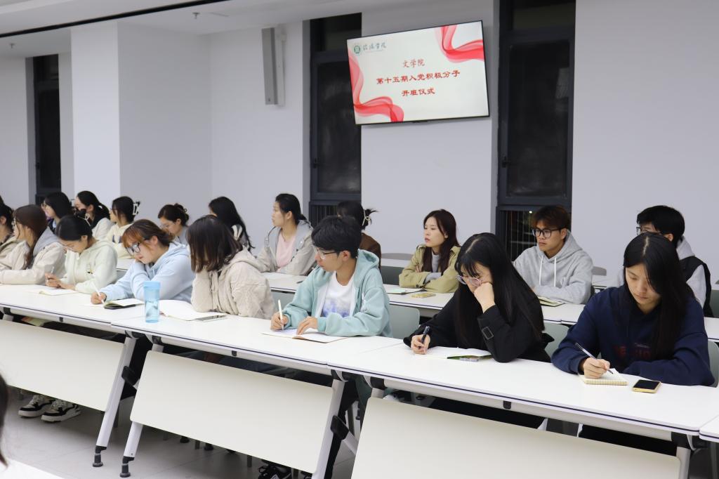 为加强新一期积极分子思想教育,提高积极分子党性觉悟,2023年11月7日晚上7点,我院在406教室举行文学院第十五期入党积极分子培训班开班典礼暨“做新时代硬核共产党员”主题党课教育活动。文学院党总支书记李赟、辅导员湛世霞和文学院第十五期积极分子参与此次活动,本次活动由湛世霞主持。