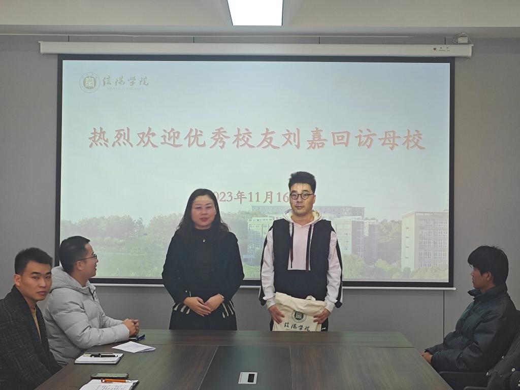 最后张红梅书记做了总结,她对校友长期以来对学校和院系的关心和支持表达了感谢,她强调,校友是母校发展的见证者,也是母校发展的推动者,是学校建设发展最可依靠的力量和最宝贵的资源,近年来学校高度重视校友工作,牵挂校友发展,将以本次会议为契机,逐步推进校友会筹备事宜,进一步为校友搭建平台,尽心尽力做好校友服务工作,同时也希望广大校友时常回访母校。最后张红梅书记为刘嘉颁发校庆纪念品,并再次对校友回访表示感谢。