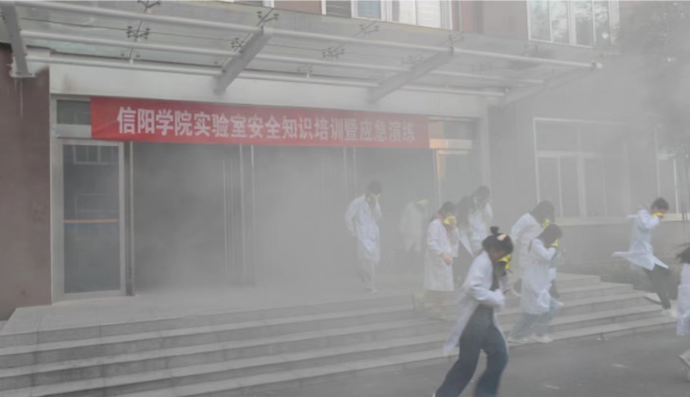 应急疏散阶段,理工楼拉响了消防警报,燃起了烟雾弹,烟雾弥漫楼宇,实验室师生迅速浸湿毛巾、手掩口鼻,跑至楼下空旷地带;三楼因烟雾滞留人员,救援小组迅速呼叫云梯车入场将人员转移到地面。疏散现场师生沉着冷静,全部井然有序地撤离到安全区域。