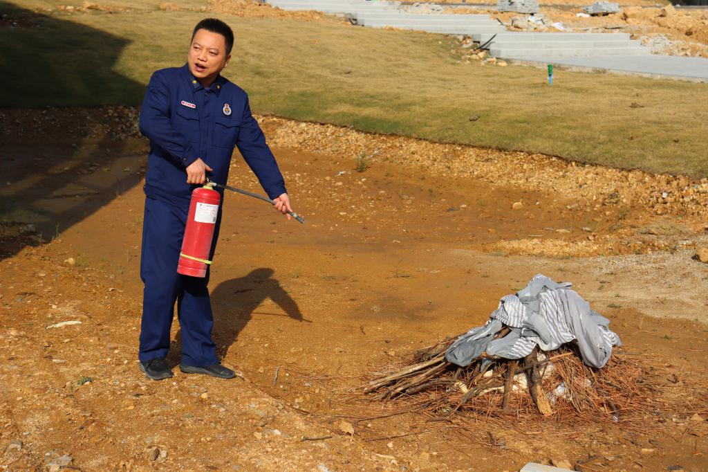 王鹏为教职工演示使用灭火器灭火的全过程并带领现场师生亲身实践,同时演练火灾发生时逃生的全过程,帮助现场大家牢牢掌握火灾应急相关知识。