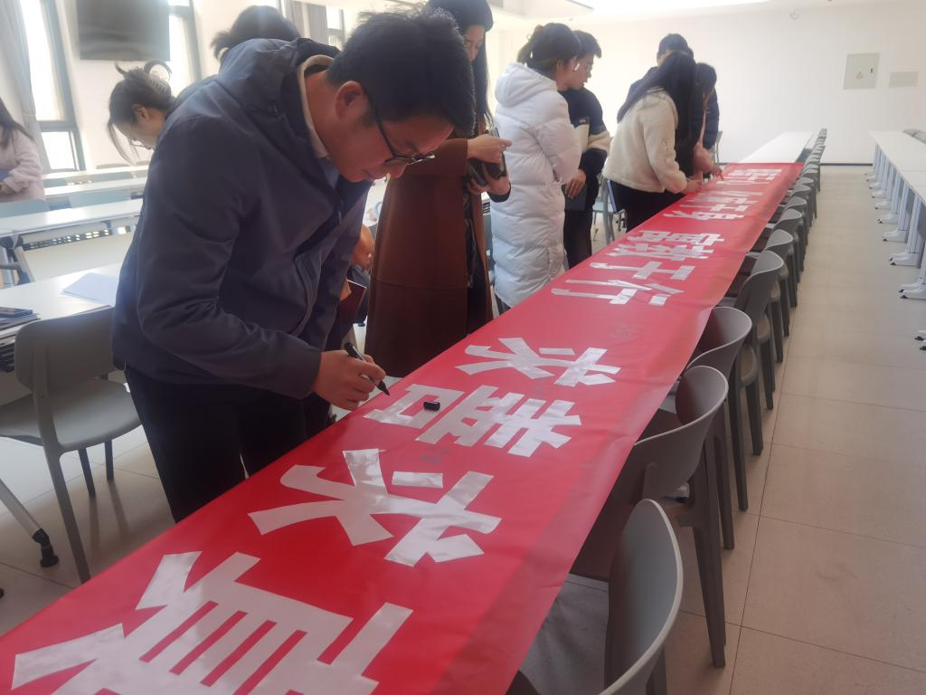 仪式最后,李赟书记带领全体辅导员依次在条幅上签字,希望每个人都能够践行誓言,为文学院的学风建设贡献新的力量。