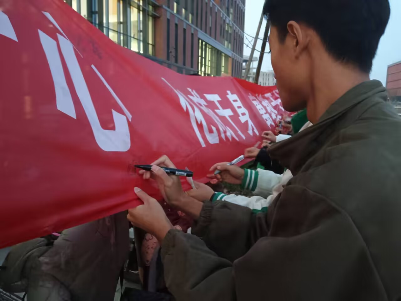学生代表也在文学院楼前依次排队在条幅上签名。