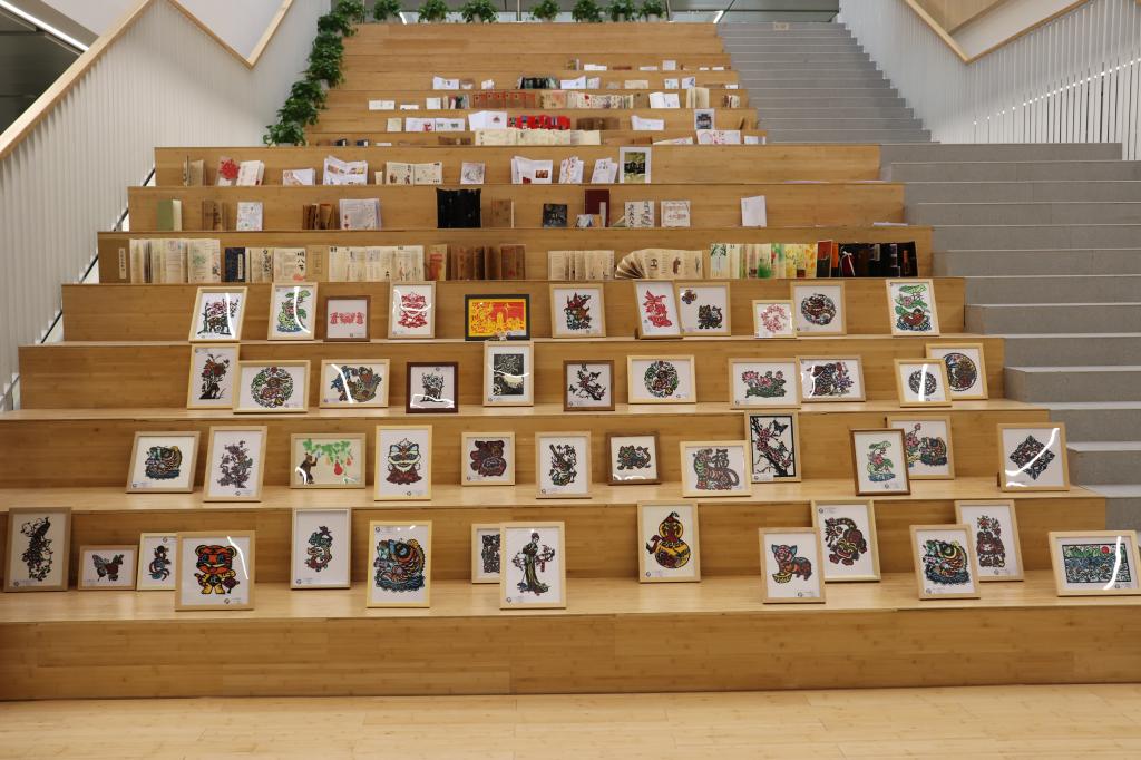 活动在大厅阶梯处展开,宣传展板炫目多彩,每班都有特色标志,展示独特的班级文化,活动现场展览品众多,生肖栩栩,葫芦生动,河山壮丽,花篮缤纷,藤蔓攀延,龙凤呈祥,展现着同学们的巧思和手艺,时有同学驻足观赏,流连惊叹。