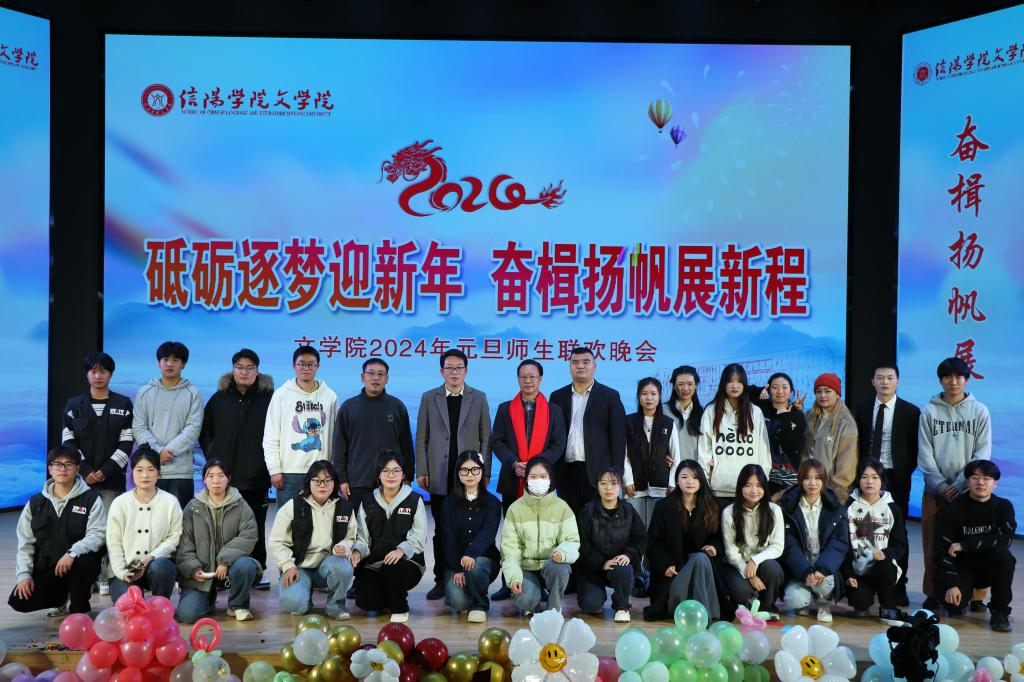 辞旧岁迎元旦,欢欢喜喜跨龙年。为丰富同学们的课余生活,展现文学院风采,12月28日晚七点,我院在教学楼113演播厅内举办2024年元旦师生联欢晚会,同时采用线上同步直播。文学院院长毛正天、党总支书记李赟、教学副院长黄亚妮、教学秘书陈浩、行政秘书陈俊、学工秘书徐远东、团总支书记何军华、文学院部分教师和学生参加了本次晚会。晚会由朱璐璐、陈延洋、刘洋硕、李妍等主持。