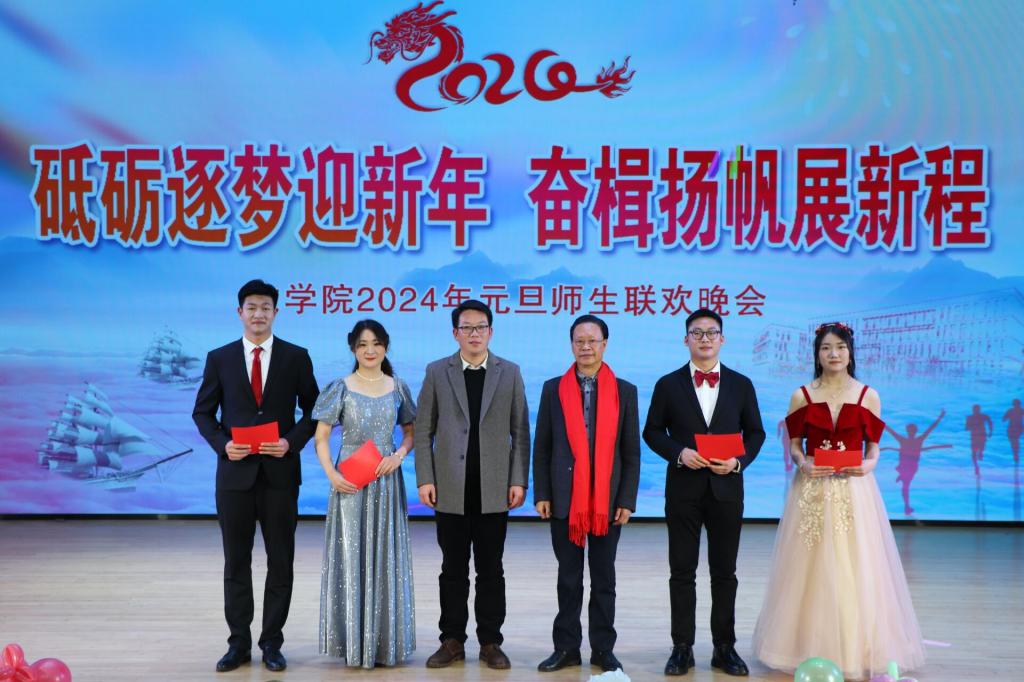 话剧表演结束,现场进行教师抽奖环节,教师何军华、陈延洋喜获一等奖,教师刘慧、冯叶、张琪、段艳琪、湛世霞和冯春晓喜获二等奖。在舞蹈《觉醒年代》中,舞者手拿宣纸,展示前辈们的怒吼,舞动脚步,体现前辈们的奋斗。给现场以触动,给观众以震撼,向青年阐释了一颗爱国之心;歌曲《因为爱情》歌手们声音婉转动听,细水流长,娓娓道来了一段美好的爱情故事,歌颂了爱情的义无反顾与执着追求;小品《你睡了没》将身体器官具象化,代表器官的演员们就熬夜问题进行表演及讨论,传达时间易逝的感慨,发出珍惜时间的祝愿。《T台秀》模特们风格多变,用专业素养和迷人气质,或展现异域风情,或体现魅力芭比,或展示酷炫风格。模特表演过后,我院教授在学生会礼仪队的搀扶下登场,学生为教授们献花,教授们依次为大家送上真切的期盼和诚挚的新年祝福。