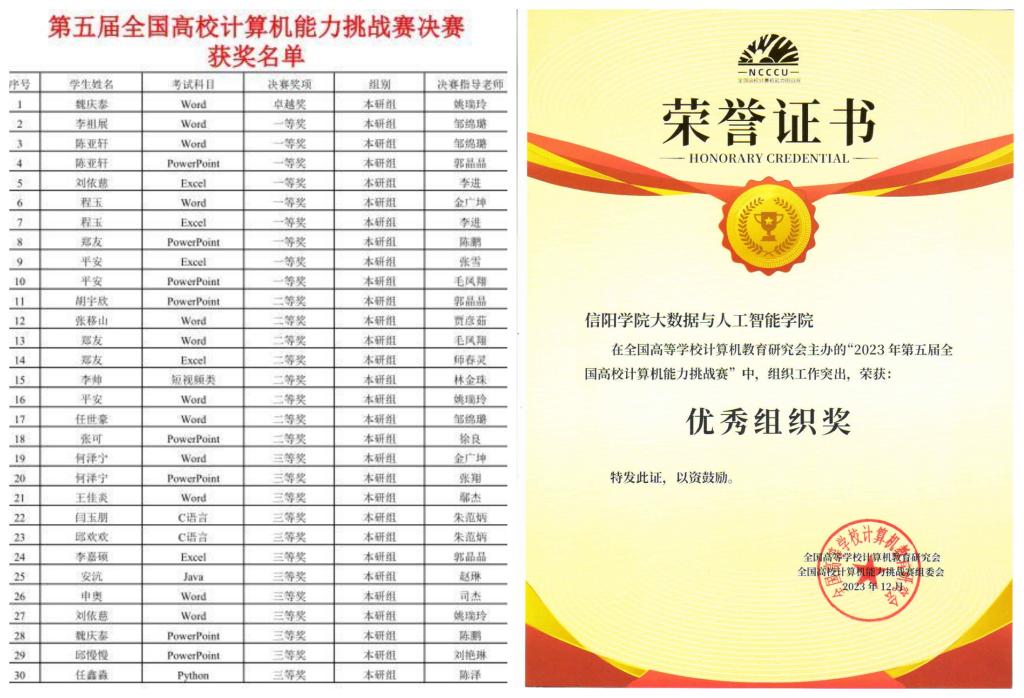 近日,第五届全国高校计算机能力挑战赛获奖名单公布,大数据与人工智能学院学子荣获大赛全国奖项卓越奖1项、一等奖9项、二等奖8项、三等奖12项。此前,学院学生还在省赛中获得一等奖19项、省级二等奖40项、省级三等奖19项。信阳学院大数据与人工智能学院获得优秀组织奖。