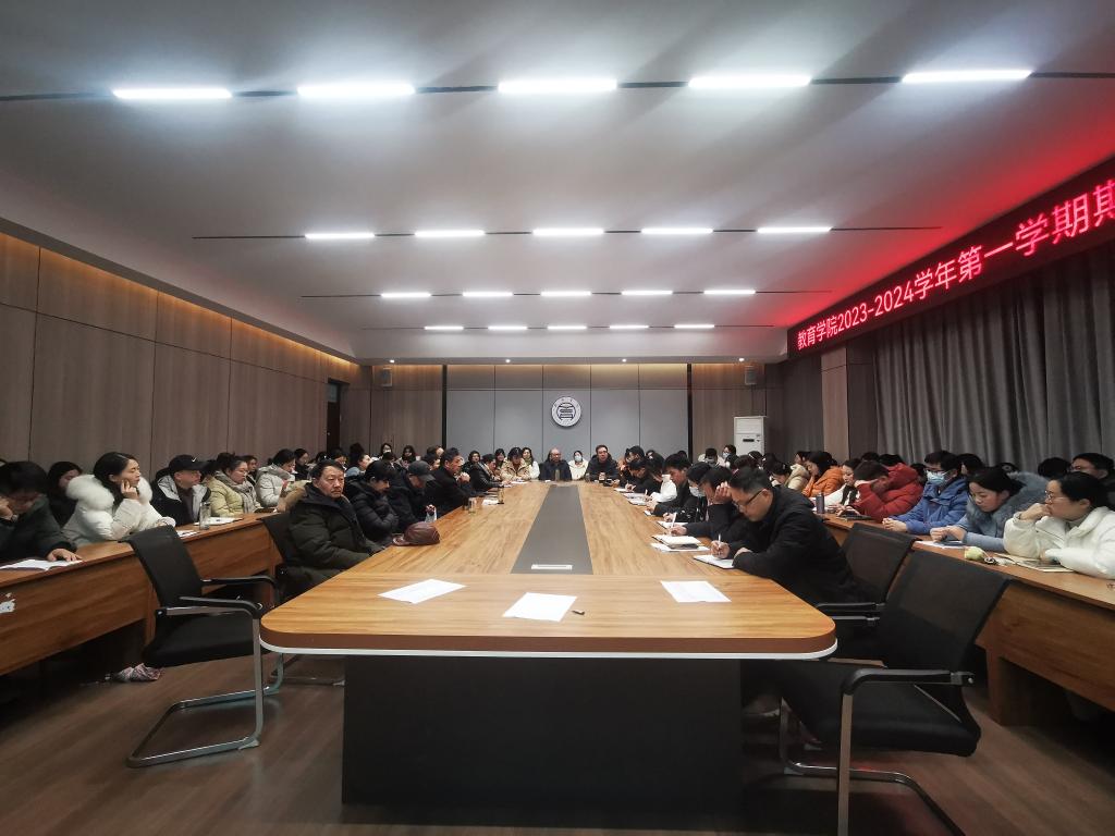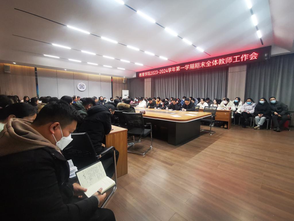 2024年1月16日下午,教育学院在109会议室召开了2023-2024学年第一学期期末全体教师工作会。名誉院长、党总支书记张甲楠、教学副院长段海丹、专家教授和全体青年教师参加了此次会议,会议分两个阶段进行,张甲楠主持了此次会议。