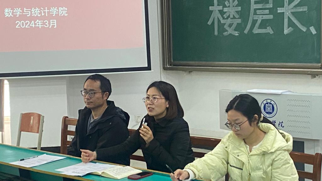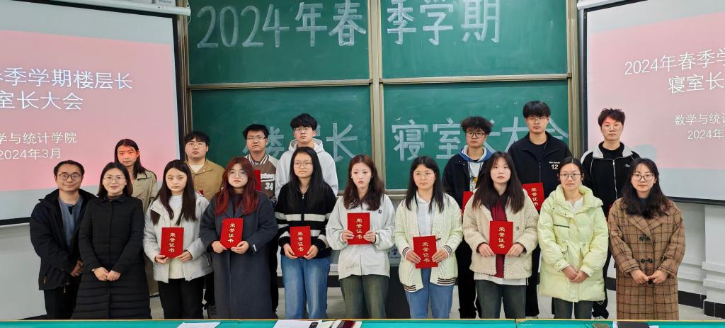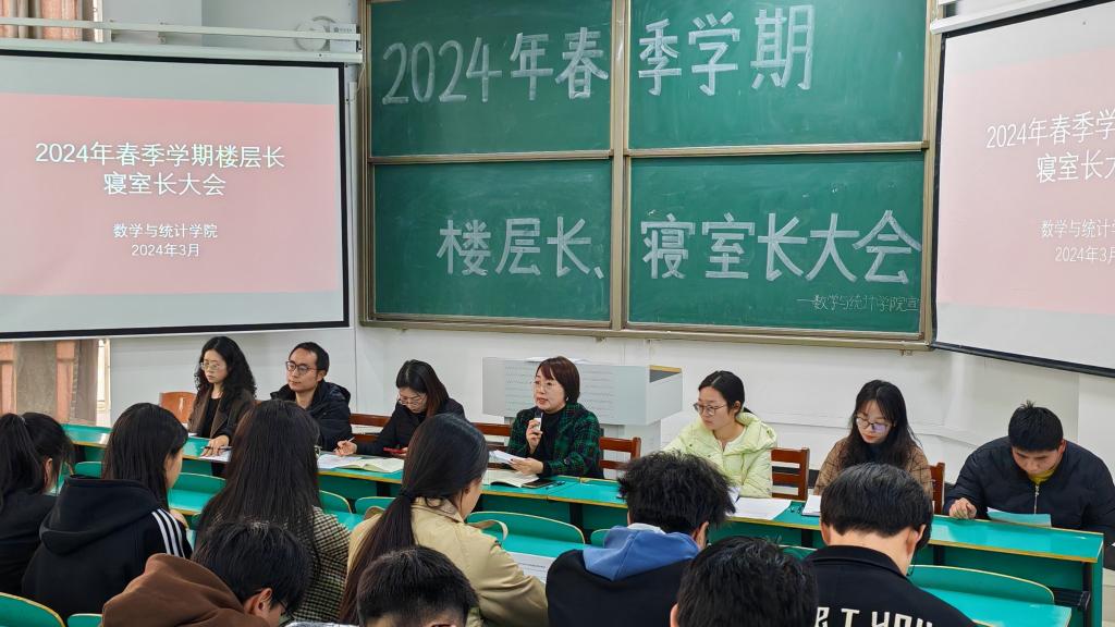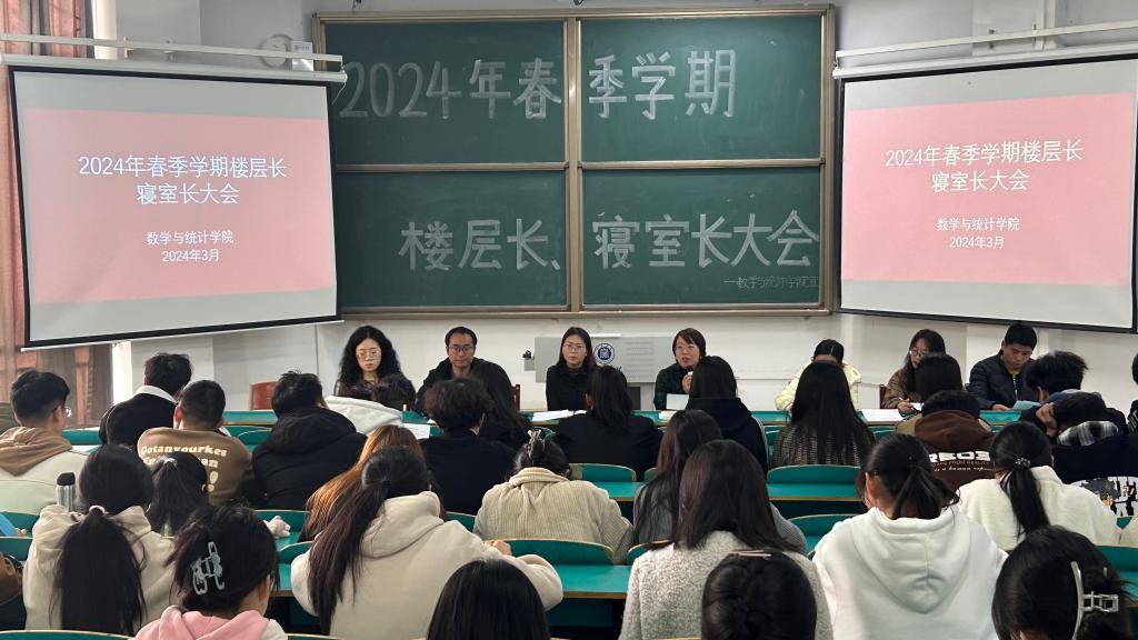 会议伊始,辅导员胡超宣读了《数学与统计学院关于2023年优秀寝室长的表彰决定》,并由优秀寝室长代表李燕发言。辅导员胡涛宣读了《数学与统计学院关于2023-2024学年第二学期楼层长、寝室长的聘任决定》。
