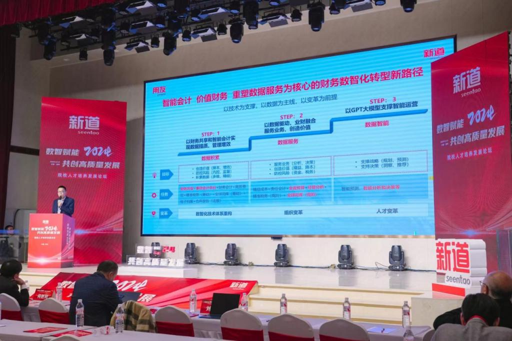 此次论坛由新道科技股份有限公司、国家数智财经行业产教融合共同体、软件和信息服务(数字技术)行业产教融合共同体主办,邀请了中国农业大学计算机中心主任兼农业大数据实验室主任教育部评估专家组成员李辉、国家数智财经行业产教融合共同体秘书长、原江苏财经职业技术学院党委副书记院长程淮中、河南工业大学副院长李焕锋、河南牧业经济学院副院长黄良杰、商丘师范学院经济管理学院副院长杨云霞等院校百余名嘉宾参加本次会议。